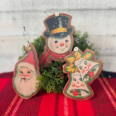 Vintage Postcard Ornament Decor - "Snowman, Santa & Bells Ornament Trio"